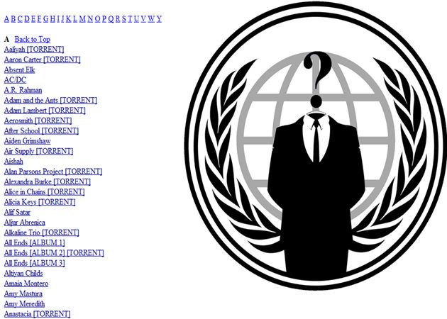 Además, Anonymous ha publicado una página con enlaces de descargas del amplio catálogo musical de Sony, ordenado alfabéticamente y con la discografía completa de grupos como AC/DC, la cantante Madonna o de Bruce Springsteen. Una forma de protesta por el cierre de Megaupload y el apoyo de Sony a leyes como SOPA. No será la ultima, ya que Anonymous promete listados y ataques contra las otras tres grandes discográficas.